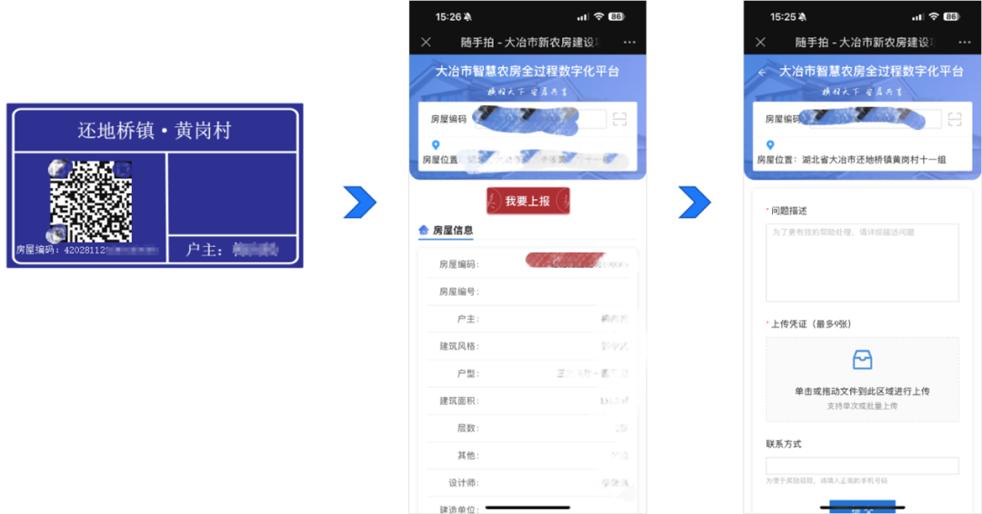 監(jiān)管系統(tǒng)數(shù)據庫可與對應部門數(shù)據庫充分對接,為每棟房屋生成專屬的二維碼房牌,實現(xiàn)線上線下一體化管理,為農房安全常態(tài)化巡查和定期體檢提供了數(shù)據和系統(tǒng)支持。農戶和相關管理人員可通過掃描二維碼上報房屋安全問題,實現(xiàn)農房安全監(jiān)管“人人參與”。將農戶自查、鎮(zhèn)村排查、縣級巡查、執(zhí)法檢查,以及群眾監(jiān)督相結合,能夠及時發(fā)現(xiàn)并采取有效措施消除安全隱患。