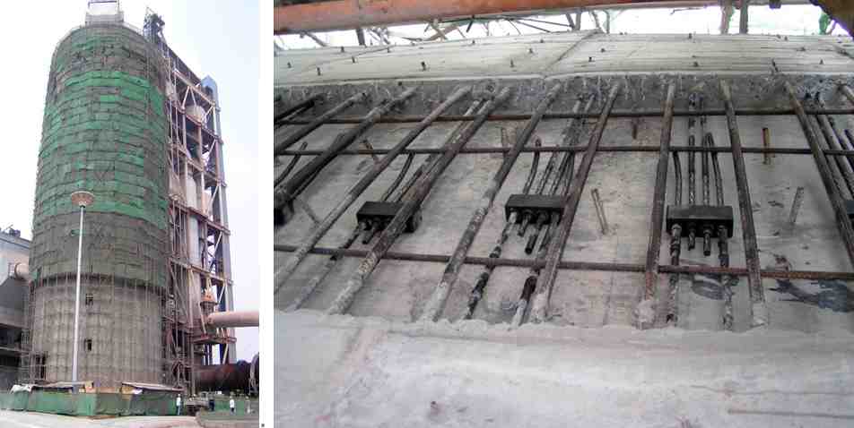 筒倉(cāng)高58m,外徑23m,壁厚380mm,采用環(huán)向配置預(yù)應(yīng)力筋,環(huán)、豎向配置單層鋼筋網(wǎng)的混凝土疊合層法進(jìn)行加固。